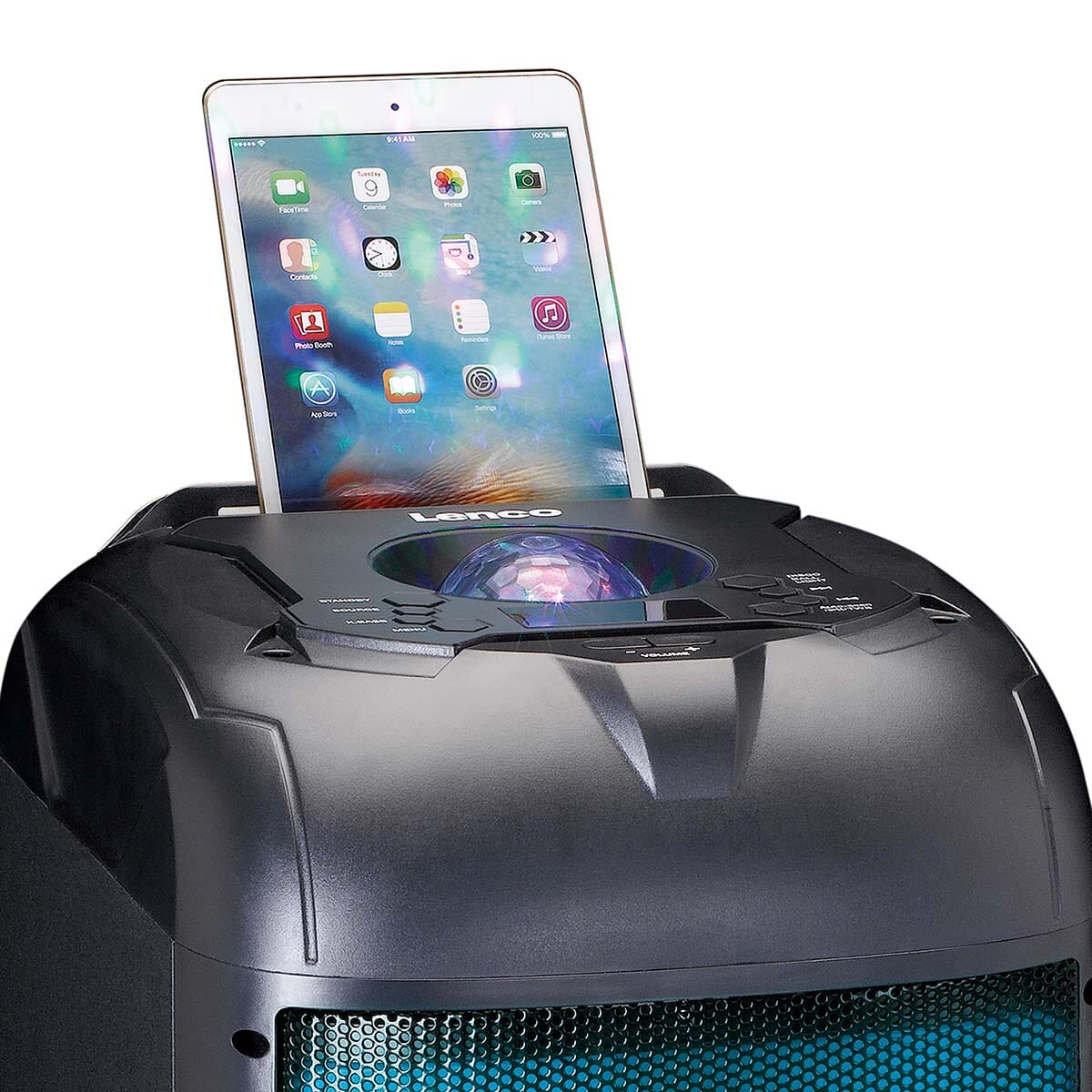 Feststemningen løftes til et nytt nivå med discokulen på toppen og den fargerike belysningen i fronten. Lyseffektene kan synkroniseres med musikken, slik at du på et øyeblikk forvandler stuen til et pulserende dansegulv.