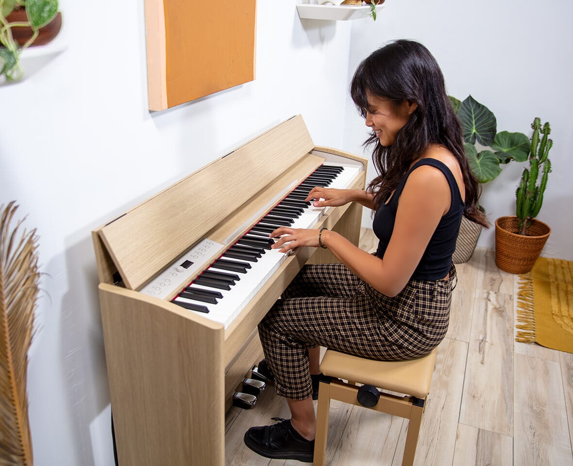 Skyv opp lokket, velg en lyd som passer humøret ditt, og opplev F701 - et gjennomført moderne piano som ser og føles like bra som det låter.