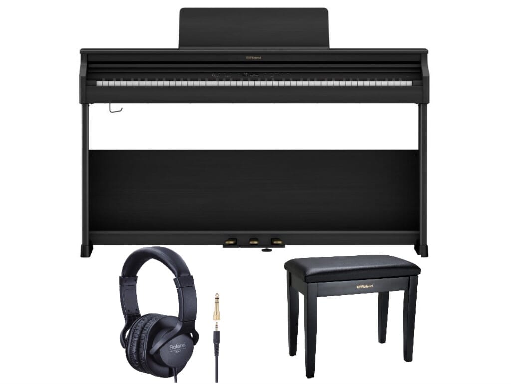 Musikktimen.no tilbyr en pianopakke i sort med pianoet RP701,pianokrakk 100 RPB, Headsett RH5 og notestativ.
