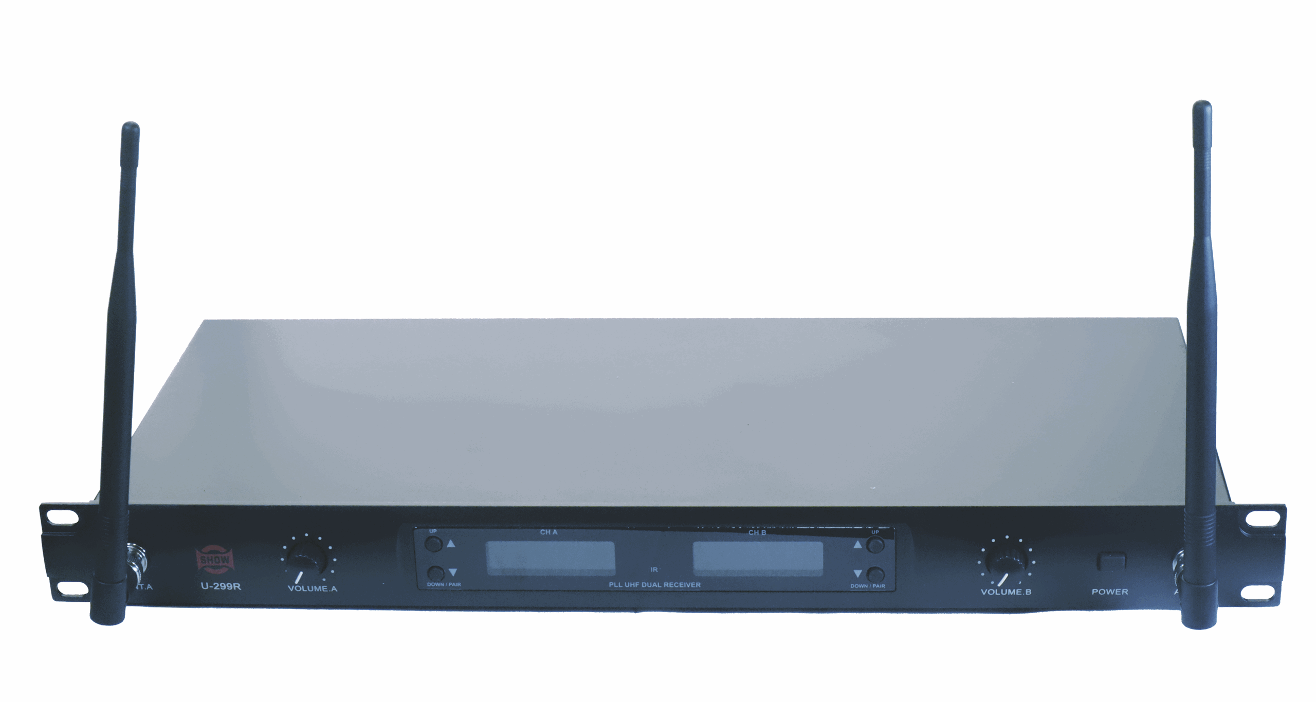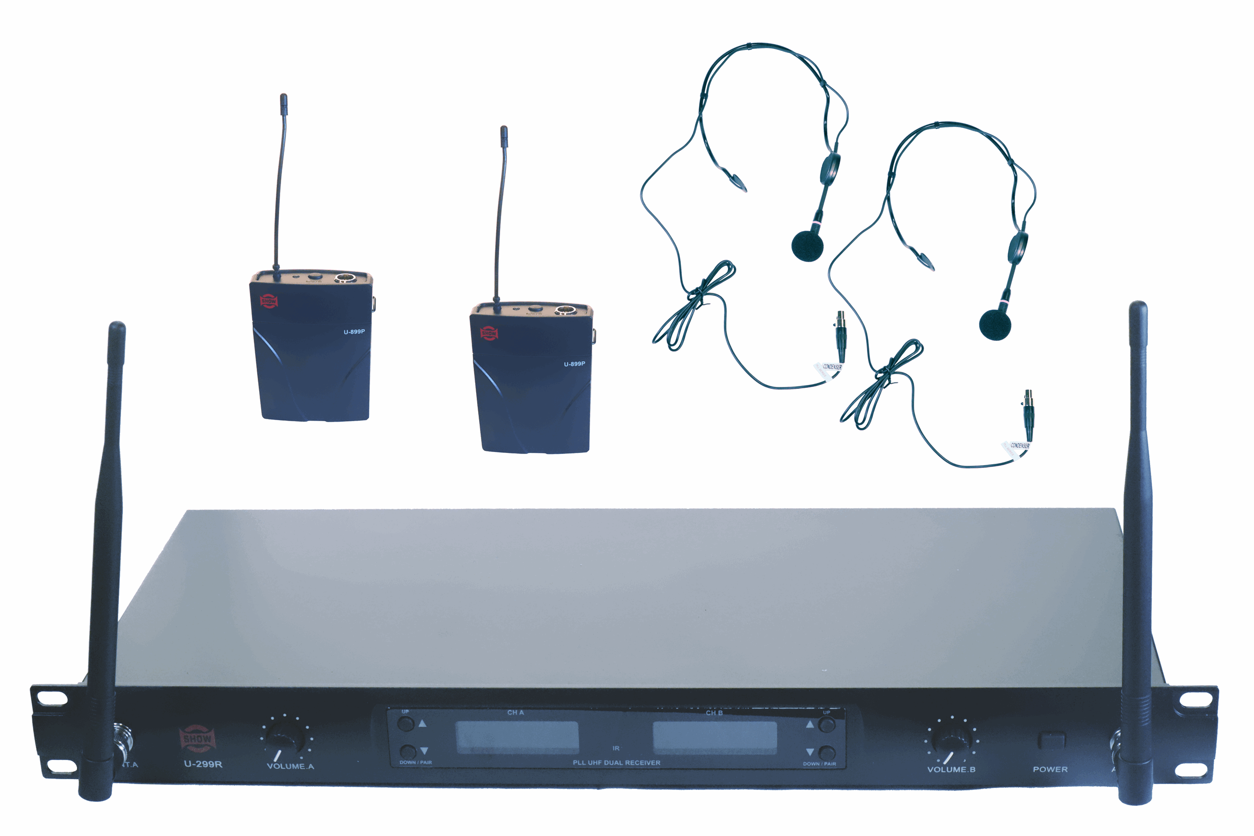 Dobbelt trådløst mikrofonsystem fra Show. Show produseres på samme fabrikk som en mengde kjente fabrikat og leverer jevn og god kvalitet på sine produkter.