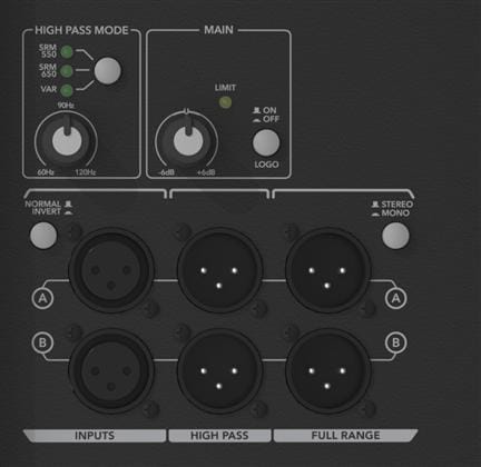 A og B input og output full range og high pass out slik at man kan bruke en sub og to topper. Kabinettet er bygd i solid kryssfiner. Den viktigste oppgraderingen her er at den har digital variabel deling. Du kan velge å bruke preset for SRM550 og SRM650 eller sette delefrekvensen selv mellom 60 og 120 hz.